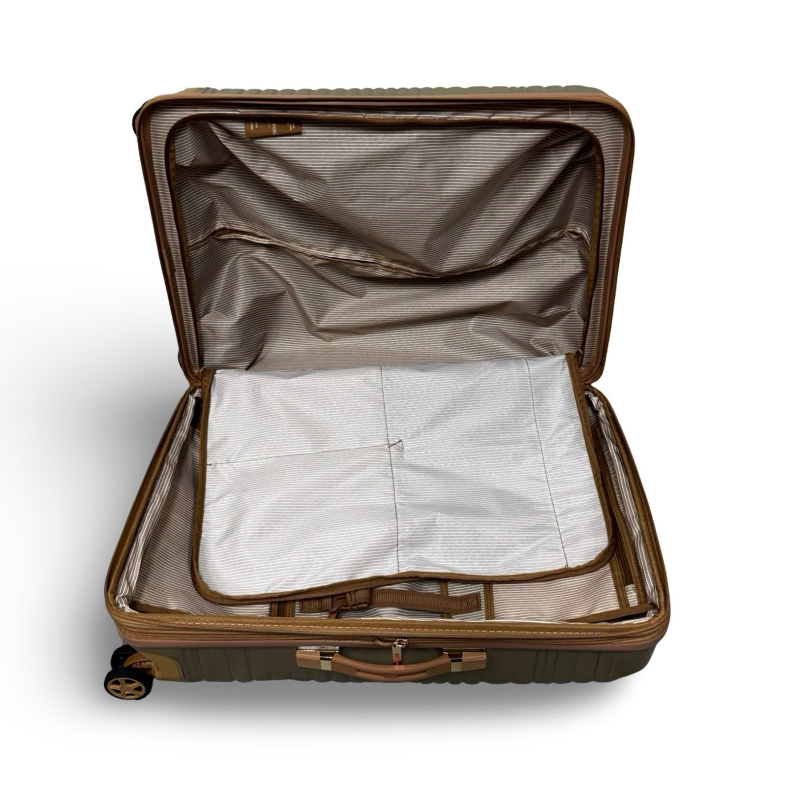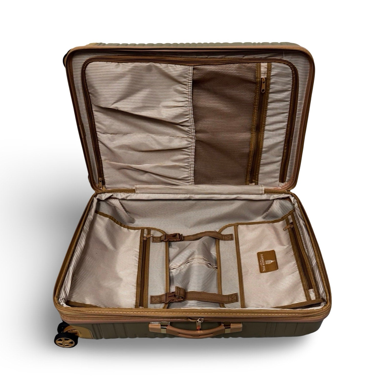 Interior has a zippered divider, two show pockets and a zippered mesh pocket.