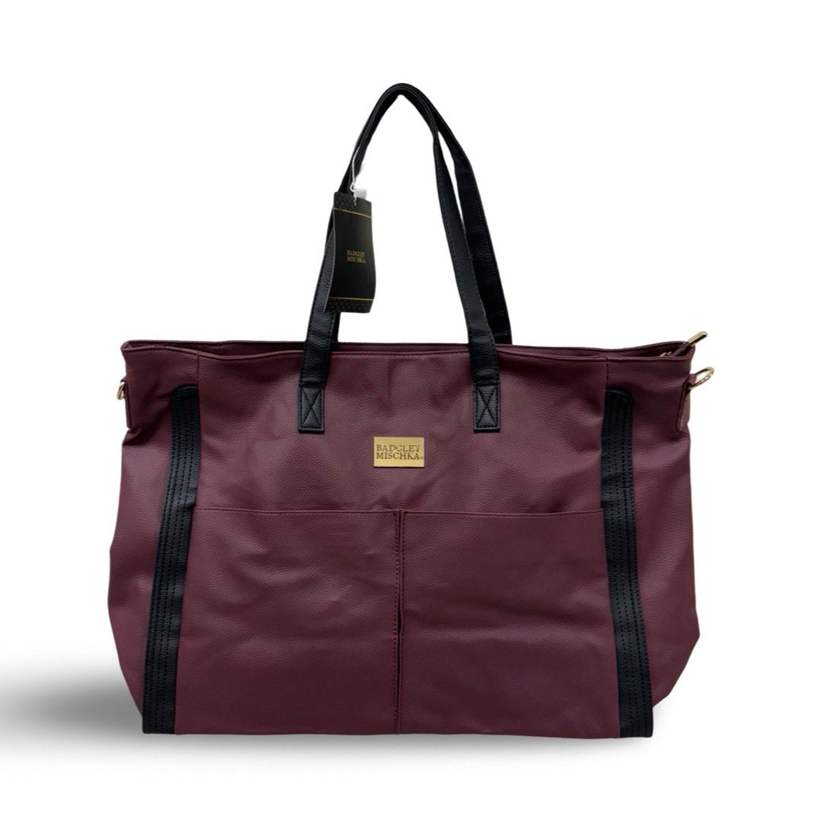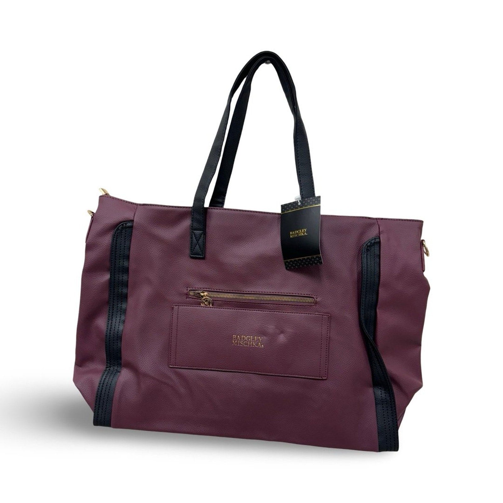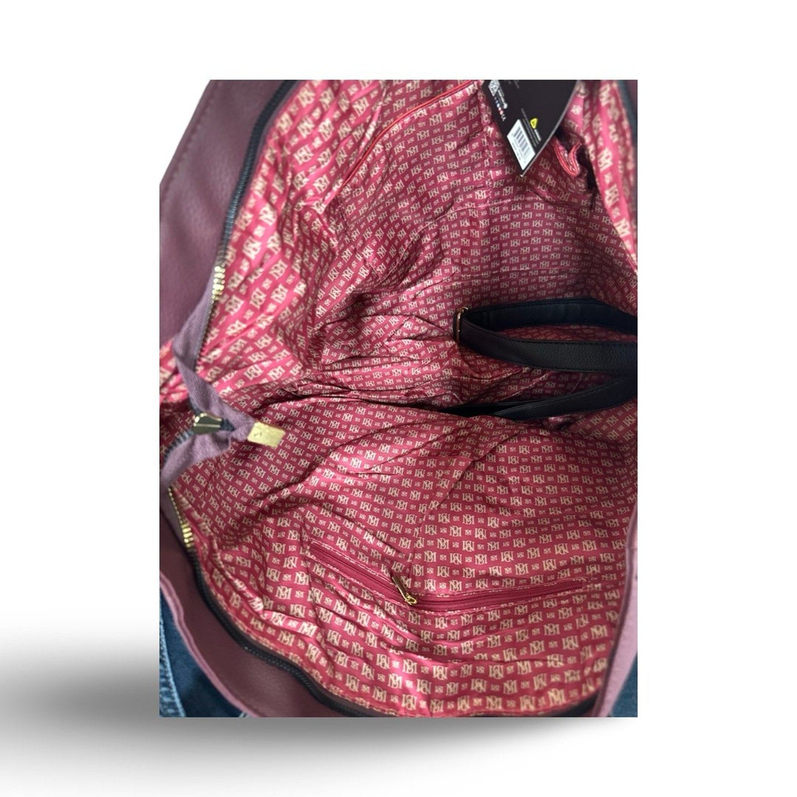 Lined interior with Badgley Mischka monogram, zip closure, and interior organizational pockets