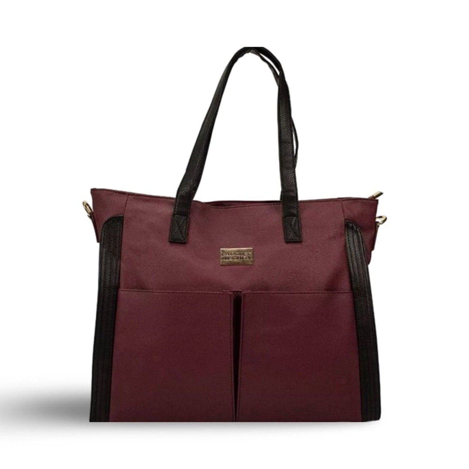 Shiny gold-tone logo plate and hardware